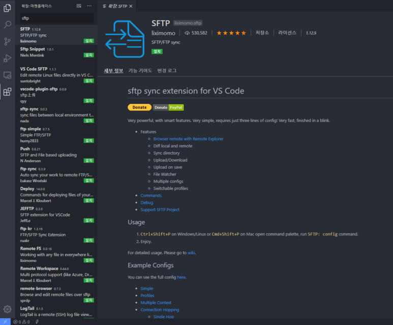 먼저, 확장 탭을 클릭 후 "SFTP" 검색한 후 아래의 이미지의 확장을 설치해 주세요.