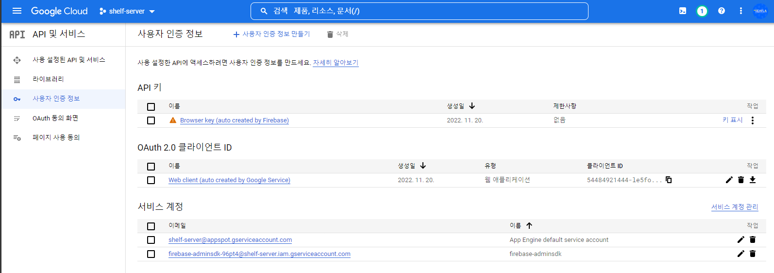 OAuth2.0 클라이언트 ID에서 계정을 클릭하면 클라이언트 ID와 클라이언트 보안 비밀 키를 확인할 수 있습니다.