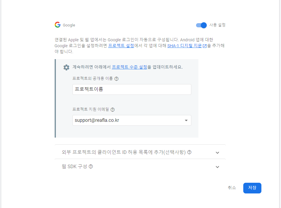 프로젝트 이름과 지원 이메일을 선택하여 저장