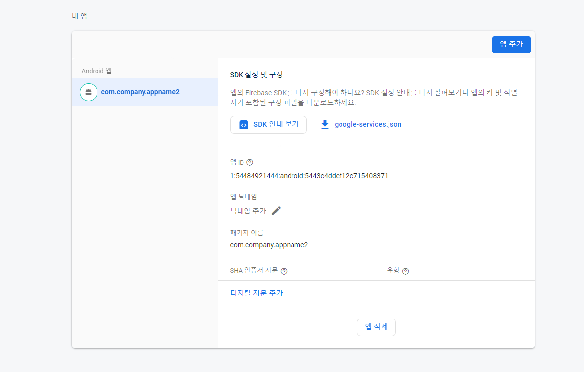 앱 추가후 프로젝트 설정 하단에 `디지털 지문 추가`