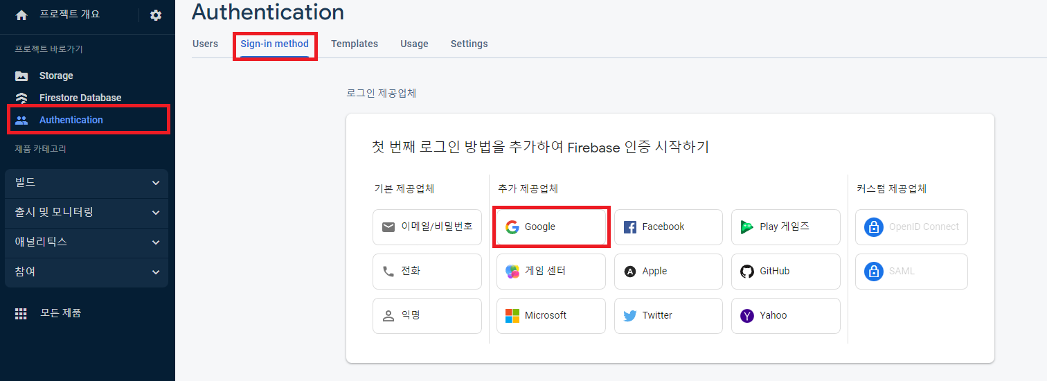 `Authentication`에서 하위 탭 `Sign-in-method` 클릭하여 `Google 선택`
