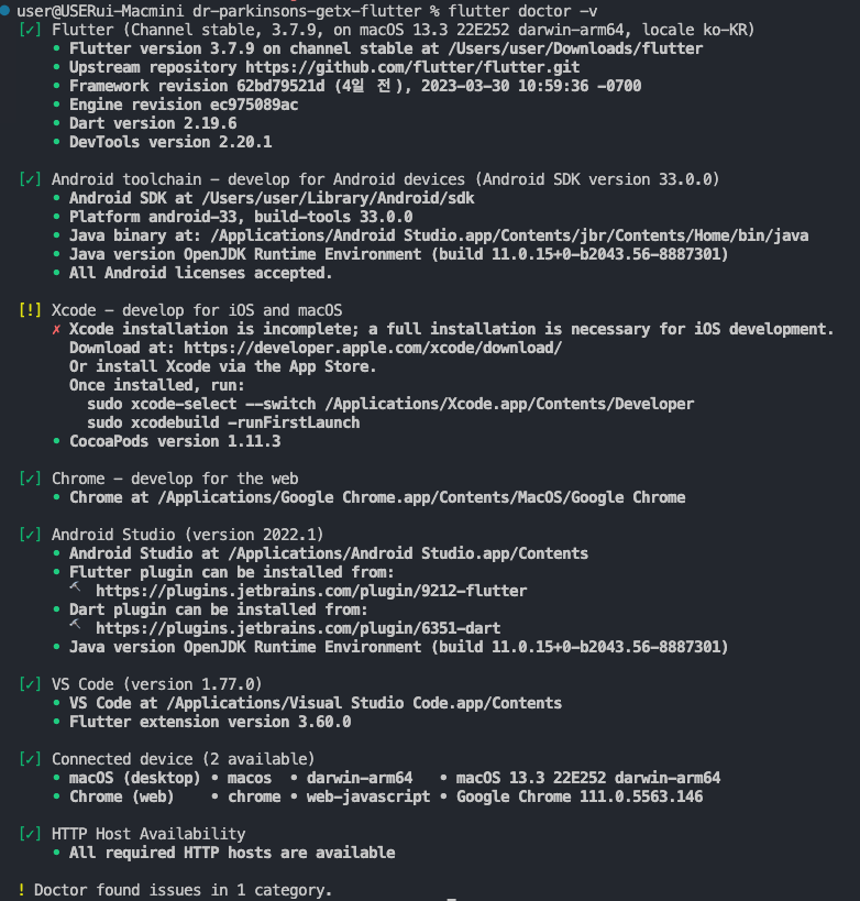 `flutter doctor -v`를 통해서 검사해 주세요.