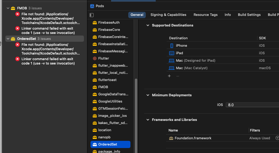 다른 패키지들을 모두 확인하여 IOS 버전이 프로젝트 General IOS 버전보다 낮은지 확인하시면 될 것 같습니다.