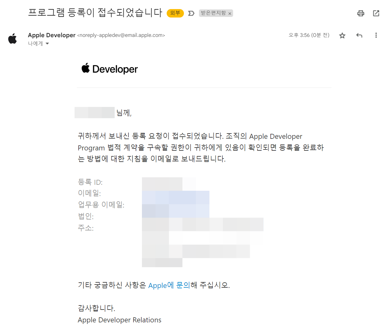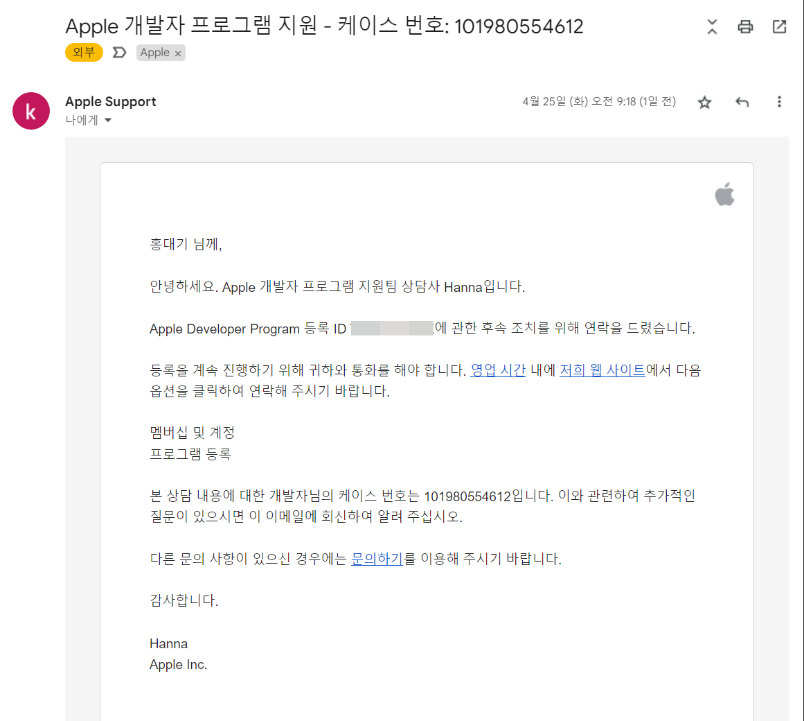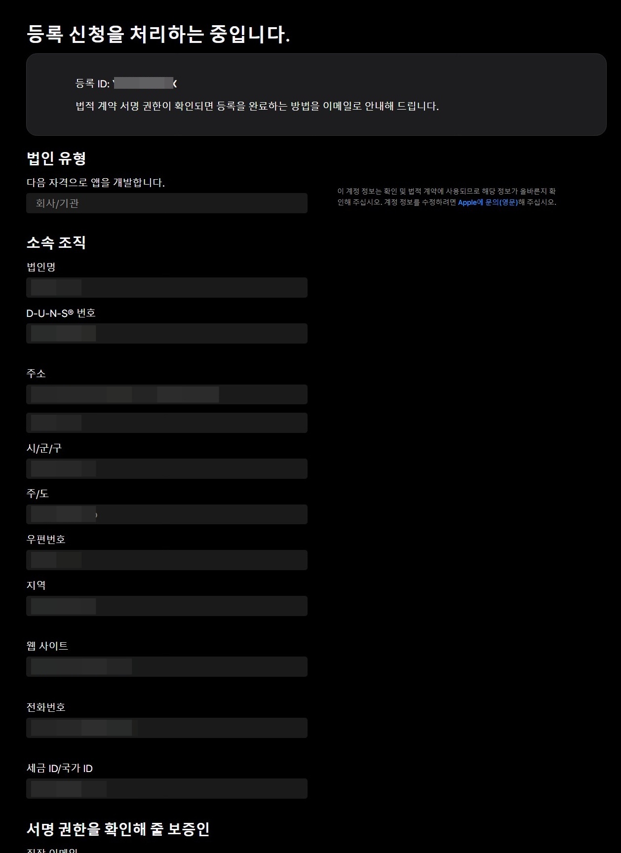 간혹, DUNS 발급 전에 애플이 조회하는 경우 조회가 안되기 때문에 애플에서 DUNS에서 발급한 사업자등록증(영문)을 애플에서 전달한 링크로 업로드해야 될 수도 있습니다.