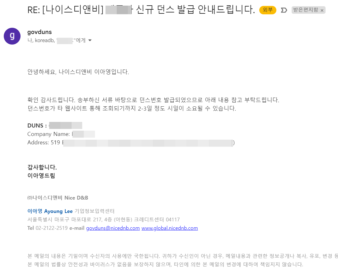 발급 후에는 입력했던 이메일로 이미지처럼 DUNS 번호가 발급됩니다.