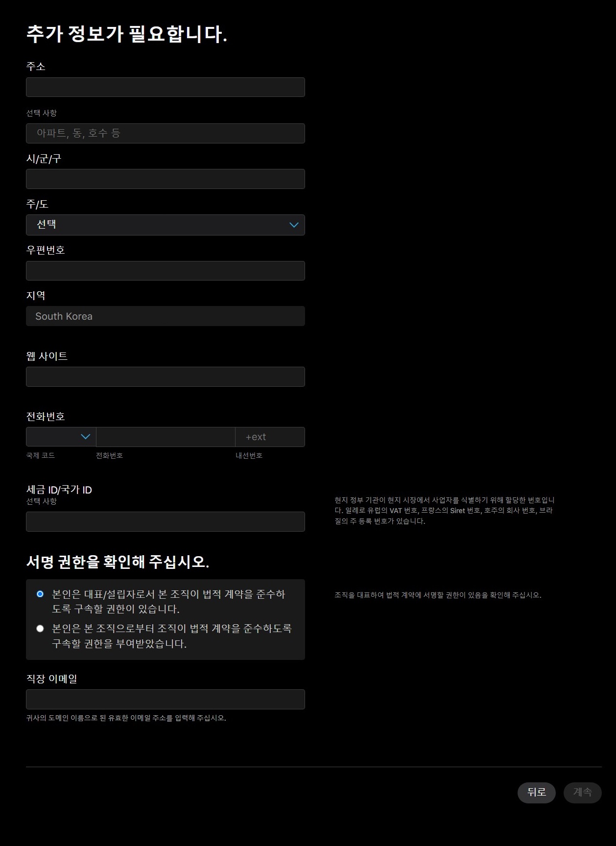 Apple 개발자 웹사이트에 로그인하면 회원가입 정보를 입력해야 합니다. 개발자 프로그램에 가입하기 위해 필요한 정보는 다음과 같습니다.