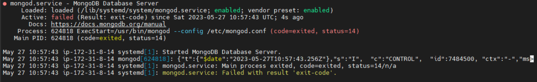 {"t":{"$date":"2023-05-27T10:50:32.377+00:00"},"s":"E", "c":"NETWORK", "id":23024, "ctx":"initandlisten","msg":"Failed to unlink socket file","attr":{"path":"/tmp/mongodb-27017.sock","error":"Operation not permitted"}}