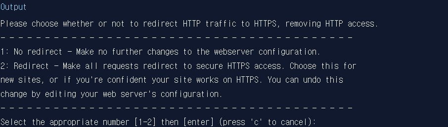 `80` 포트로 들어온 경우 `443` 즉, `HTTPS`로 리다이렉트를 할 것인지 물어보면 `2`번을 눌러 리다이렉트 설정