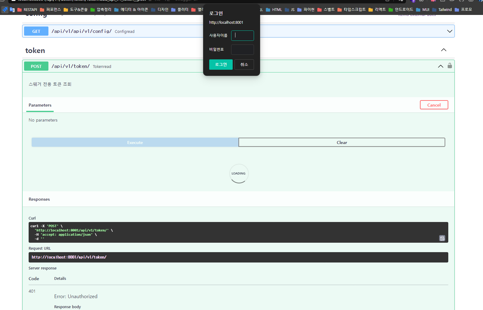 스웨거 문서를 보면 각 API 호출 부분 오른쪽에 자물쇠 아이콘이 생기며, `Execute` 클릭 시에 계정 인증을 요구합니다.