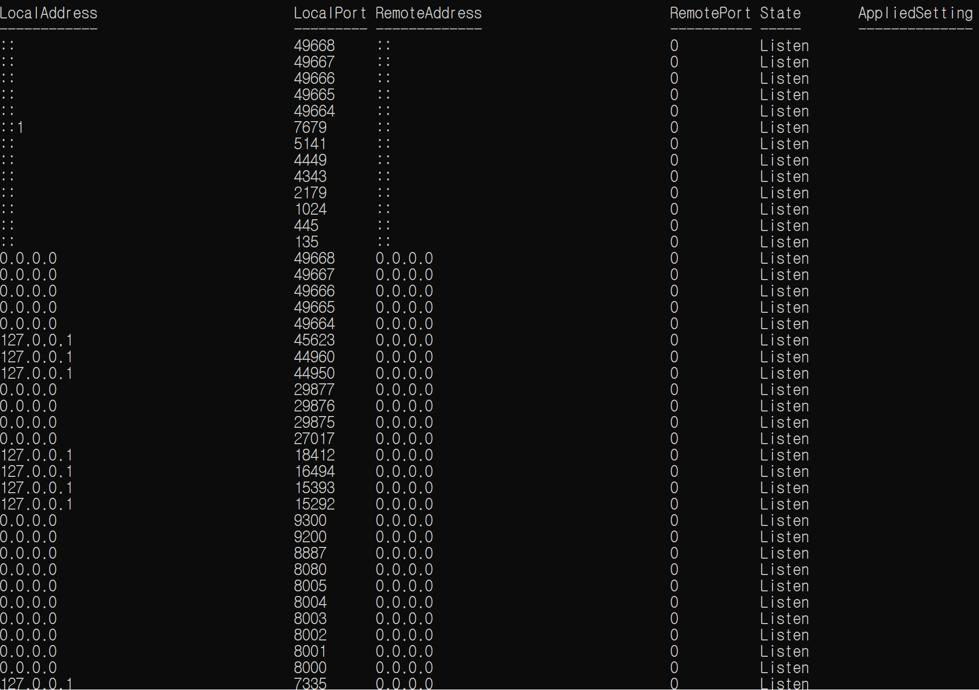 Get-NetTCPConnection | Where-Object {$_.State -eq "Listen"}