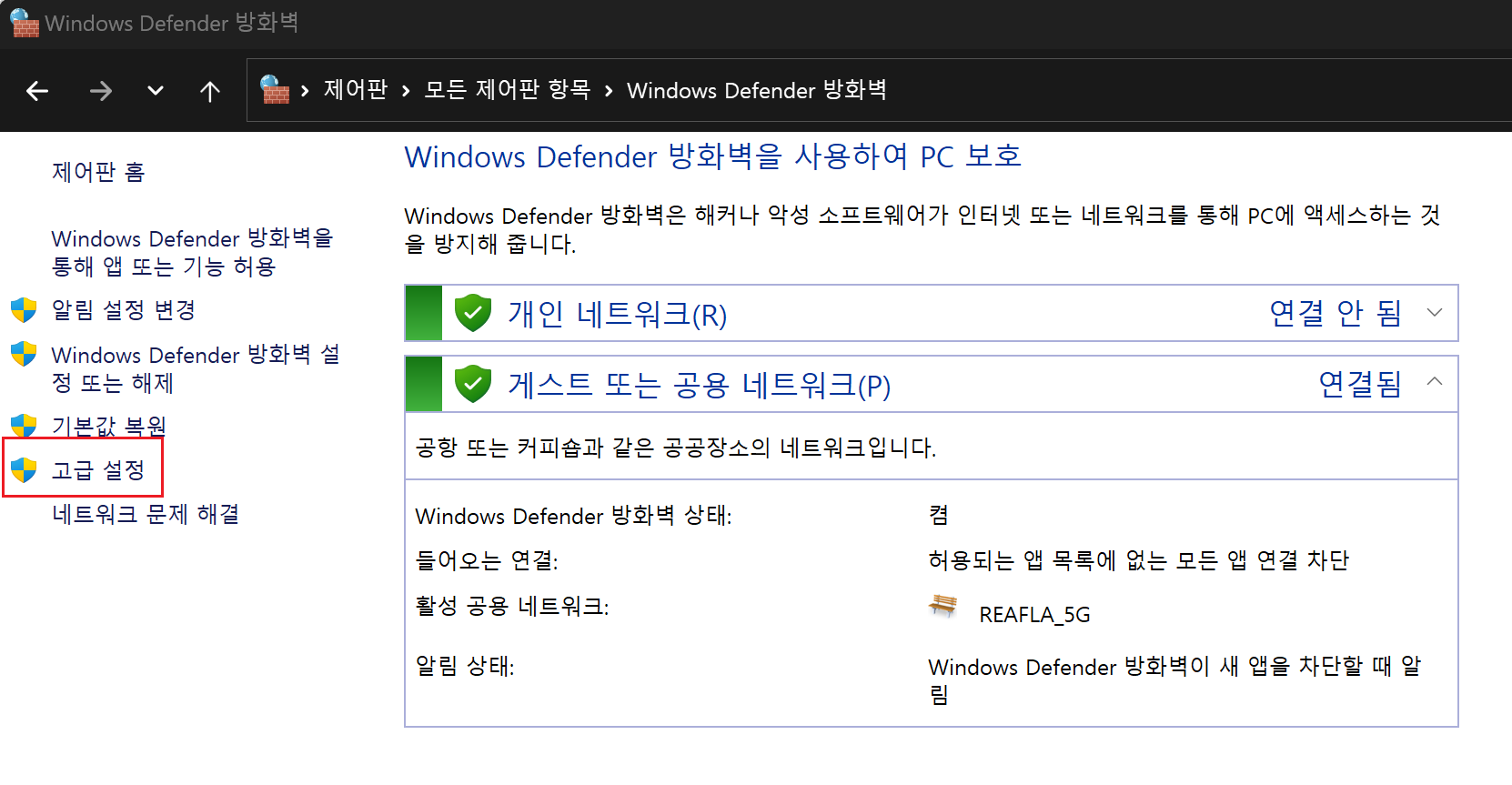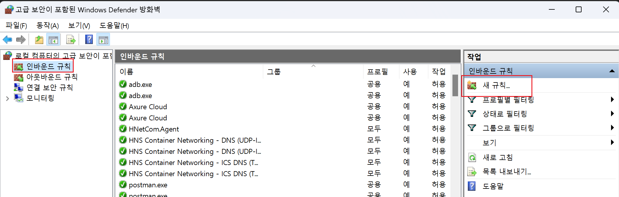 제어판 - 시스템 및 보안 - Windows Defender 방화벽 - 고급설정 - 인바운드 규칙