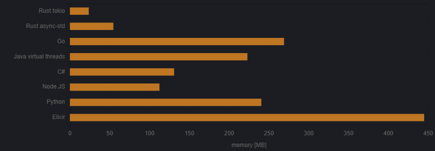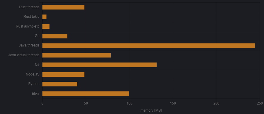 Rust, Go, Java, C#, Python, Node.js, Elixir 같은 인기 언어를 사용한 비동기 및 멀티 스레드 프로그래밍 간의 메모리 소비를 비교해 보았습니다.