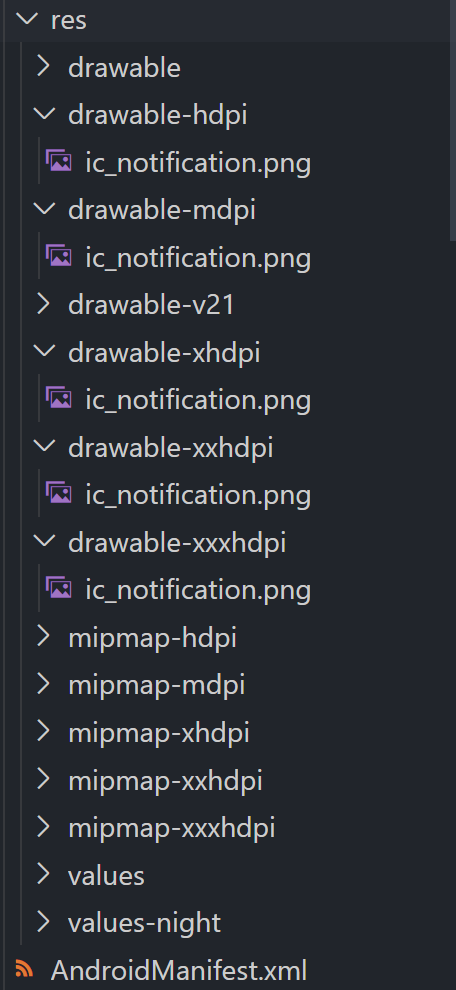 대부분 "@mipmap/ic_launcher"로 되어있을텐데, 만약 앱 아이콘과 푸시 알림 아이콘이 다르면 "@drawable/원하는 이름"으로 설정한 뒤에 "android/app/src/main/res" 안에 "drawable-mdpi ~ xxxhdpi" 폴더를 만든 후 원하는 파일 이름으로 만들어 넣어주면 됩니다. 그러면 앱 아이콘과 푸시 알림 아이콘을 다르게 설정할 수 있습니다.
